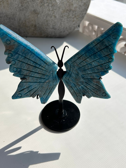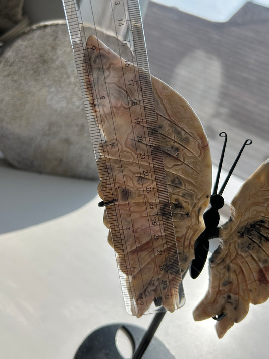 Crazy Lace Agate Butterfly Wing Carvings on Stand